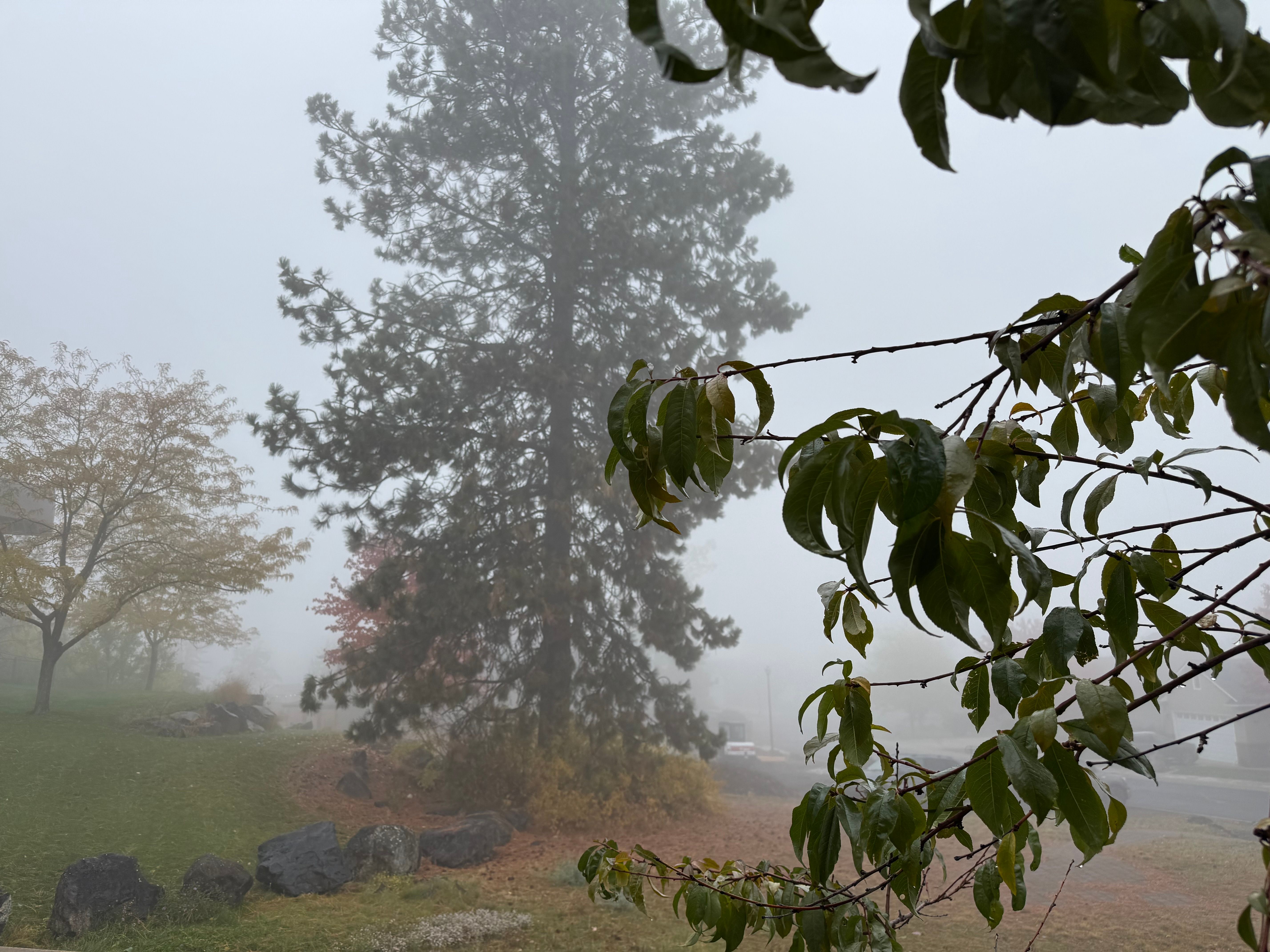 It’s the first foggy morning of autumn in Spokane, a proper fog, one that keeps and holds the light of the morning and never quite lets go. Here, the fog does a beautiful thing with the pine trees: they recede in a gradient collective, trunks and boughs getting fainter and fainter, like a line of ghosts. The paint color I chose for my first home here was called “ghost pines,” and it is not the same color as this phenomenon. Where I grew up, in sage country, fog is a swallowing thing. There is even less to mark the distance.